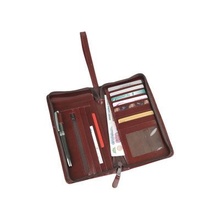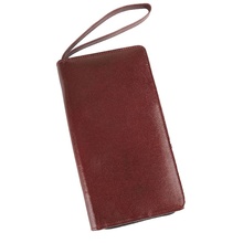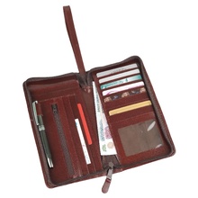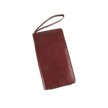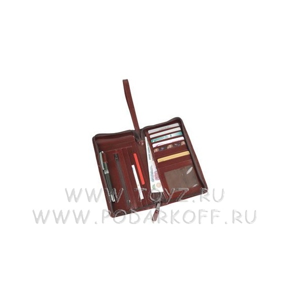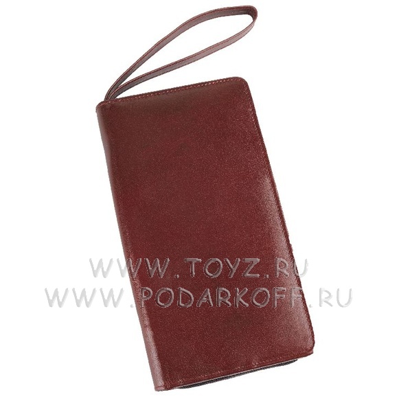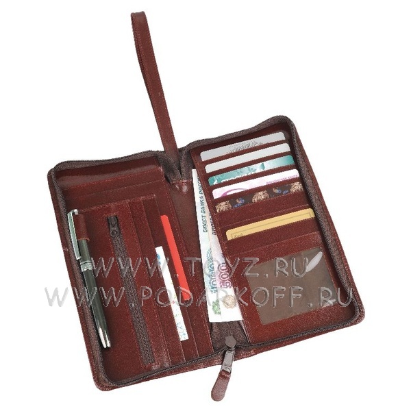 Портмоне для путешествий коричневого цвета, с ремешком на руку. Имеет отделения для банкнот и банковских карт.