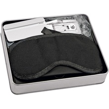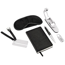 Главная » Корпоративные подарки » Досуг » Путешествия » Набор для путешествий: повязка на глаза для спокойного сна в дороге, бирка и кодовый замок для багажа, лампа с клипсой, записная книжка, ручка
