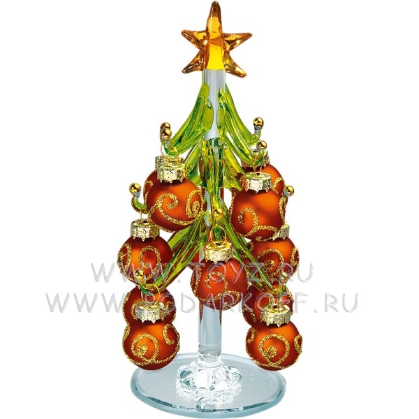 Стеклянная ёлка на зеркальной подставке с миниатюрными шариками, красные с золотистым орнаментом. Накануне Рождества елку надо нарядить и поставить в офисе или дома. Праздничное настроение и удача га